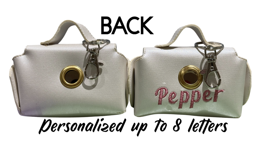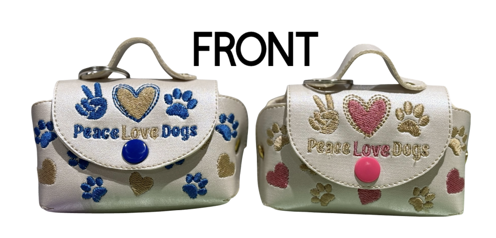 Walk your pooch in style with this custom embroidered, vegan leather, poop bag holder! Personalize this little bag with your pet’s name (up to 8 letters) and remember “Peace, Love, and Dogs!”